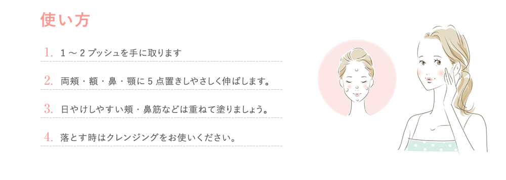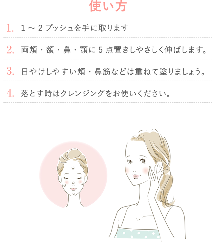 お使いのスキンケアで肌を整えた後、顔全体にムラなくのばし、なじませます。