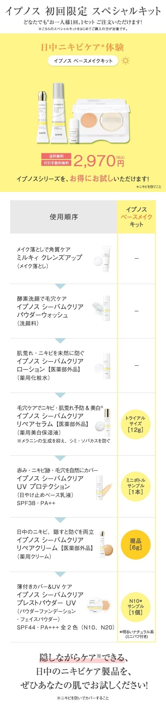 その他の成分:精製水、デカメチルシクロペンタシロキサン、ミリスチン酸オクチルドデシル、ジプロピレングリコール、スクワラン、ドデカメチルシクロヘキサシロキサン、1,3-ブチレングリコール、1,3-プロパンジオール、メチルポリシロキサン、ポリオキシエチレン・メチルポリシロキサン共重合体、アーティチョークエキス、アラキルグルコシド・アラキルアルコール・ベヘニルアルコール、モノステアリン酸ポリオキシエチレンソルビタン、N-ラウロイル-L-グルタミン酸ジ(コレステリル・オクチルドデシル)、ポリオキシエチレン硬化ヒマシ油、架橋型メチルポリシロキサン、カルボキシビニルポリマー、パラオキシ安息香酸エステル、アクリル酸・メタクリル酸アルキル共重合体、濃グリセリン、エデト酸二ナトリウム、グリセリル-N-(2-メタクリロイルオキシエチル)カルバメート・メタクリル酸ステアリル共重合体、ユキノシタエキス、アルギン酸ナトリウム、硫酸亜鉛、キトサン、グリコール酸
